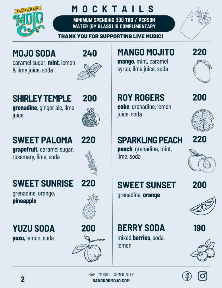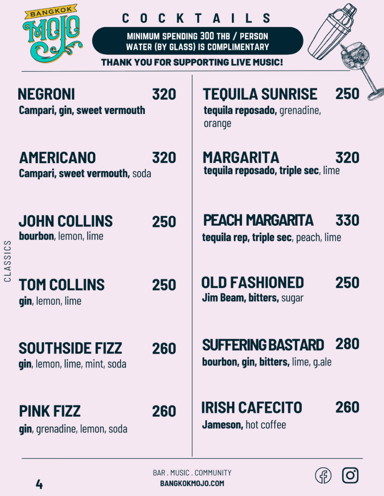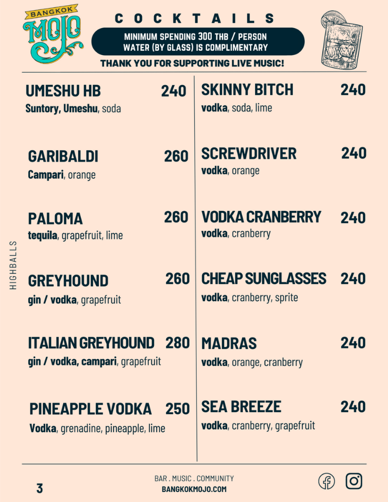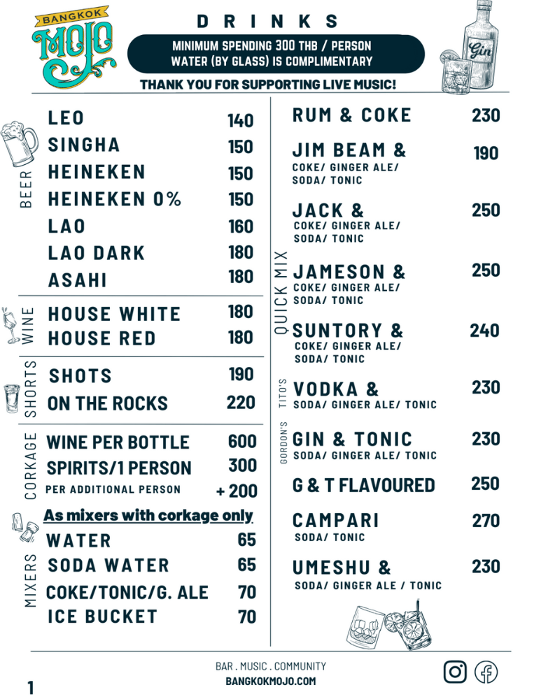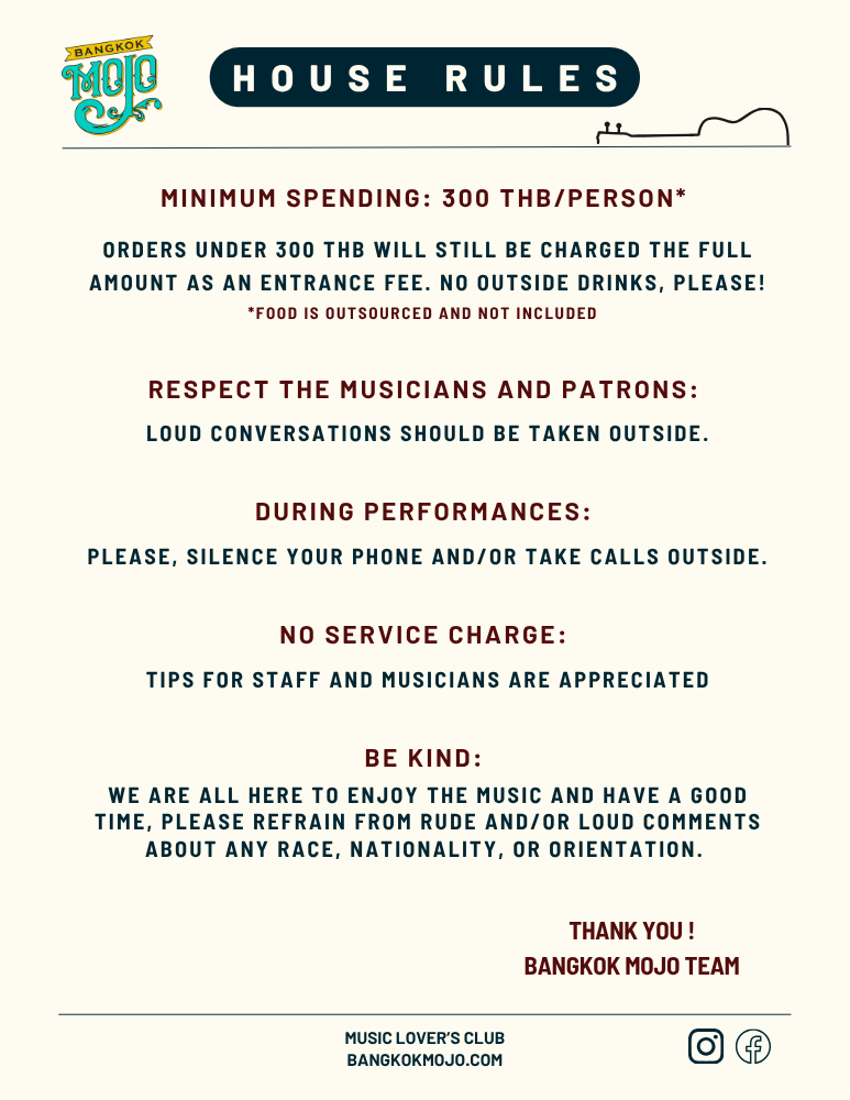 We are a MUSIC LOVER’S CLUB, the entrance is FREE, but we have a 300 THB spending minimum/person. Please check out our house rules and menu below!